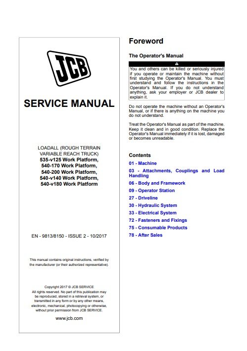 The JCB 535-V125, JCB 540-170, JCB 540-200, and JCB 540-V180 Service Repair Manual is an essential resource for maintaining and repairing your JCB machinery. This comprehensive guide provides detailed instructions, diagrams, and troubleshooting tips to ensure optimal performance and longevity of your equipment. With clear, step-by-step procedures, you can confidently tackle repairs and maintenance tasks, saving time and reducing downtime. Invest in this manual to enhance your operational efficiency and keep your JCB machines running smoothly