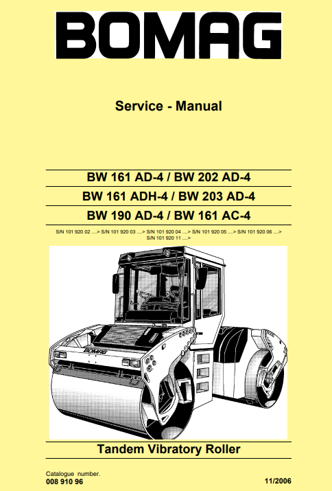 Comprehensive service repair manual covering Bomag BW 161 AD-4, BW 202 AD-4, BW 161 ADH-4, BW 203 AD-4, BW 190 AD-4, BW 161 AC-4Bomag BW 161 AD-4, BW 202 AD-4, BW 161 ADH-4, BW 203 AD-4, BW 190 AD-4, BW 161 AC-4 Service Repair Manual
