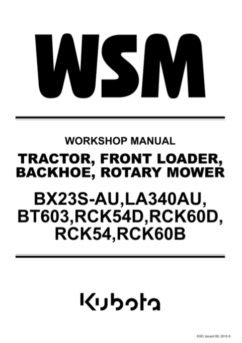 Workshop repair manual for Kubota BX23S, LA340, BT603, RCK54D, RCK60D, RCK54, and RCK60B tractorsKubota BX23S, Kubota LA340, Kubota BT603, Kubota RCK54D, Kubota RCK60D, Kubota RCK54, Kubota RCK60B Tractors Workshop Repair Manual
