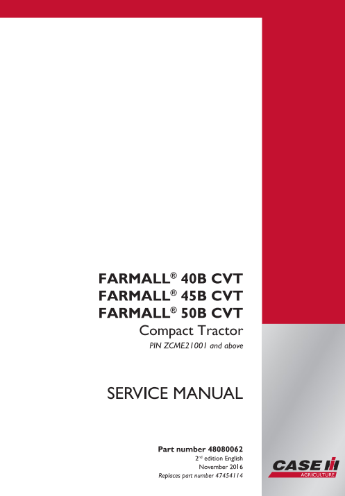The Case Farmall 40B CVT, Farmall 45B CVT, and Farmall 50B CVT Tier 4B Tractor Service Repair Manual is a comprehensive factory-style workshop manual created for technicians, mechanics, and tractor owners who need accurate service and repair information. This manual provides step-by-step instructions for maintaining, diagnosing, and repairing Case Farmall B-series CVT tractors.