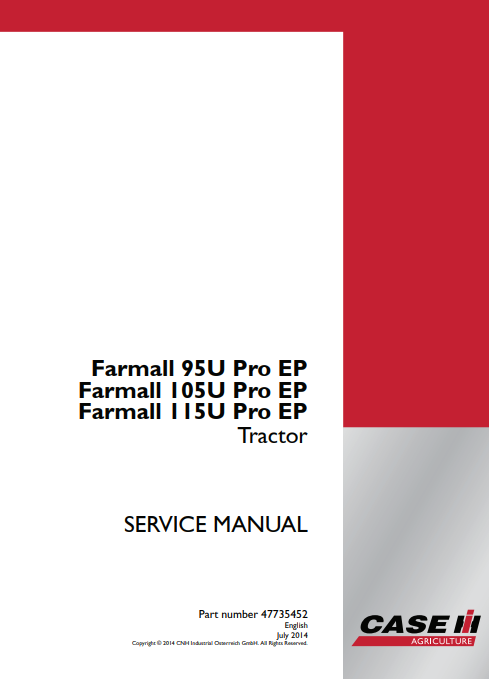 Enhance your maintenance capabilities with the Case Farmall 95U Pro, 105U Pro, and 115U Pro Service Repair Manual. This comprehensive guide is designed to provide you with detailed instructions and insights for servicing and repairing your Case Farmall tractors, ensuring optimal performance and longevity. With clear diagrams and step-by-step procedures, you can confidently tackle any repair task, saving time and money while keeping your equipment in peak condition. Invest in this essential manual to empower your farming operations and maintain the reliability of your machinery