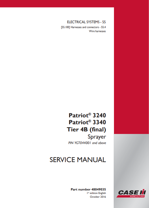 Enhance the performance and longevity of your Case 3240 and Case 3340 Patriot Sprayers with our comprehensive Service Manual focused on the Electrical System. This essential guide provides detailed schematics, troubleshooting tips, and maintenance procedures to ensure your sprayer operates at peak efficiency. With clear instructions and expert insights, you can confidently tackle electrical issues, minimize downtime, and maximize productivity in the field. Invest in this manual today to keep your equipment running smoothly and reliably