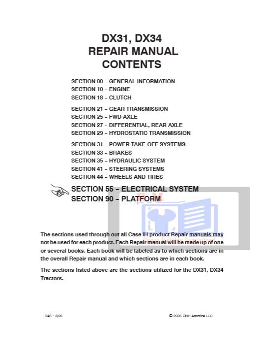 Ensure your Case IH DX31 and DX34 tractors stay powered and reliable with this in-depth Electrical System Manual. Designed for technicians, mechanics, and DIY owners, this manual provides complete guidance on diagnosing, testing, and repairing the full electrical system of these versatile compact tractors.