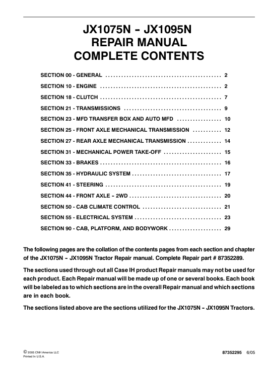 | Included Items | Complete Service Repair Manual for Case JX1095N Tractor |