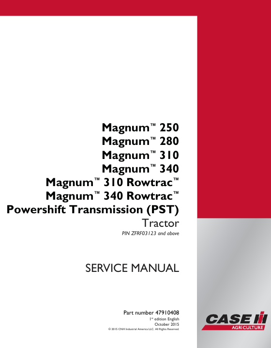 Original Factory Service Repair Manual for the Case Magnum 340 Rowtrac Tractor. This manual is very detailed and contains all the official CASE manufacturer specifications, troubleshooting, repair instructions step by step with illustrations and wiring diagrams. Simple to complicated repairs can be completed effortlessly with the information provided. It is 100 percent complete and intact. The manual is specifically written for the the experienced mechanic