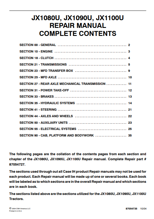 chapter of the JX1080U, JX1090U, JX1100U Repair manual. Complete Repair part # 87054727