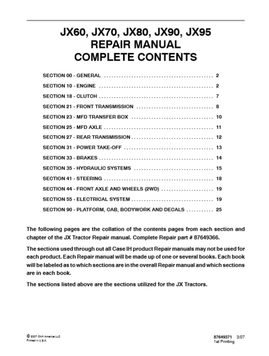 The full potential of your Case JX60, JX70, JX80, JX90, and JX95 tractors with our comprehensive Service Repair Manual, meticulously designed to provide you with all the essential information needed for effective maintenance and repair. This manual is an invaluable resource, featuring detailed diagrams, step-by-step instructions, and troubleshooting tips that cover everything from engine diagnostics to hydraulic system repairs. Whether you are a seasoned mechanic or a dedicated owner looking to perform your own maintenance, this manual empowers you to keep your tractor running smoothly and efficiently. With clear illustrations and easy-to-follow procedures, you can confidently tackle any repair task, ensuring your equipment remains in peak condition for years to come. Invest in this essential guide today and experience the peace of mind that comes with knowing you have the right tools at your fingertips to maintain your Case tractor