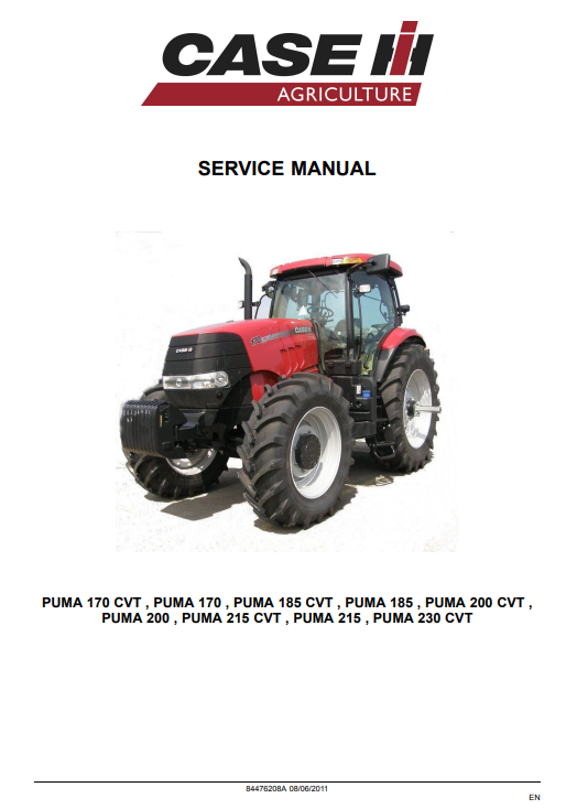 Comprehensive service manual for Case Puma 170, 185, 200, and 215 models, featuring CVT variantsCase Puma 170CVT, Puma 170, Puma 185CVT, Puma 185, Puma 200CVT, Puma 200, Puma 215CVT, Puma 215, Puma 230CVT Service Repair Manual
