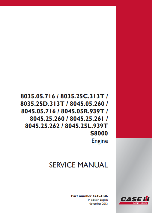 The Case S8000 Series Engine Service Repair Manual is an essential resource for anyone looking to maintain or repair their Case S8000 series engine with confidence and precision. This comprehensive manual provides detailed step-by-step instructions, diagrams, and specifications that cover everything from routine maintenance to complex repairs. With its user-friendly layout, mechanics of all skill levels can easily navigate through troubleshooting tips, parts identification, and service procedures. Whether you are a professional technician or a dedicated DIY enthusiast, this manual ensures that you have the knowledge and tools necessary to keep your engine running smoothly and efficiently, ultimately saving you time and money on repairs. Invest in the Case S8000 Series Engine Service Repair Manual today and empower yourself with the expertise to tackle any engine issue head-on