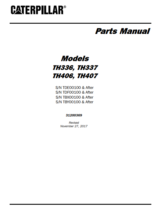 Enhance the performance and longevity of your Caterpillar TH336, TH337, TH406, and TH407 telehandlers with our comprehensive Parts Manual. This essential guide provides detailed diagrams, part numbers, and specifications, ensuring you can easily identify and source the right components for maintenance and repairs. With this manual, you can minimize downtime and maximize productivity, making it an indispensable resource for operators and technicians alike. Invest in your equipment’s efficiency and reliability today