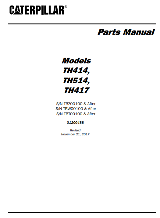 Parts manual for Caterpillar TH414, TH514, and TH417 telehandlers, detailing components and maintenance informationCaterpillar TH414, Caterpillar TH514, Caterpillar TH417 Telehandlers Parts Manual