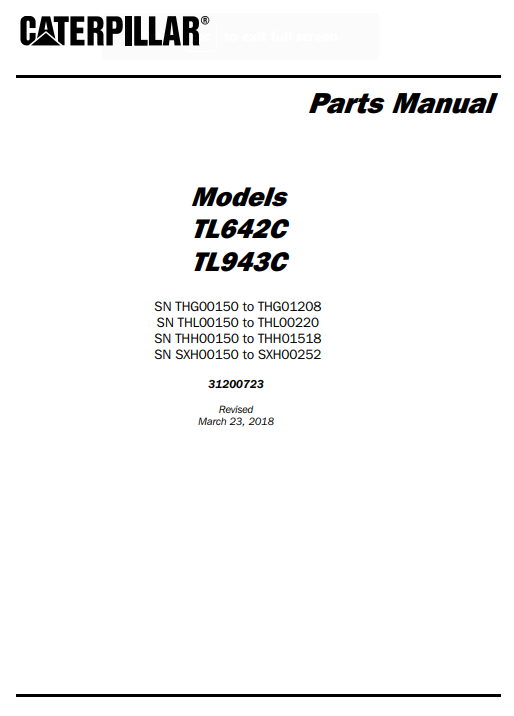 Enhance the performance and longevity of your Caterpillar TL642C and TL943C telehandlers with our comprehensive Parts Manual. This essential guide provides detailed diagrams and specifications, ensuring you can easily identify and source the right components for maintenance and repairs. With clear instructions and expert insights, you can keep your equipment running smoothly and efficiently, minimizing downtime and maximizing productivity. Invest in this invaluable resource to maintain the reliability of your telehandlers and ensure they operate at peak performance
