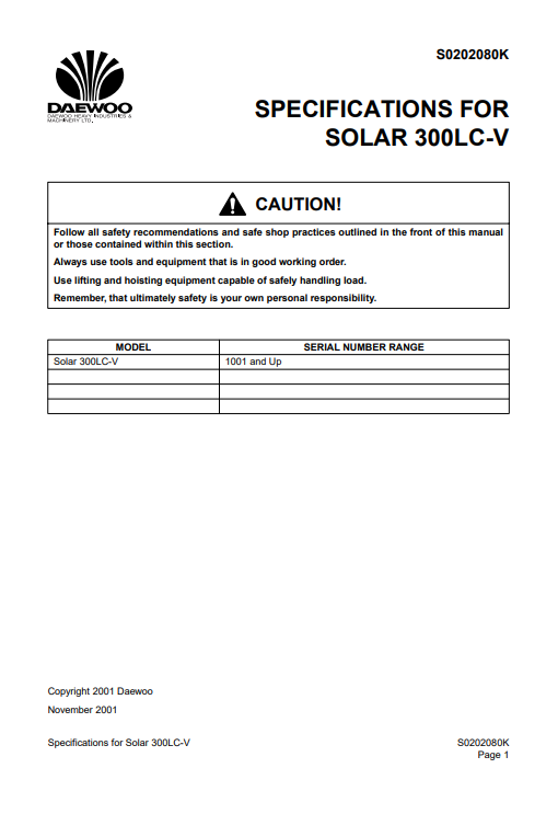 Daewoo Solar 300LC-V [Serial Number 1001 and Up]