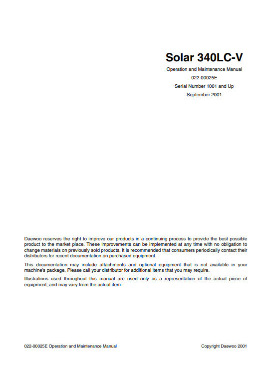 Daewoo Solar 340LC-V Operation and Maintenance Manual