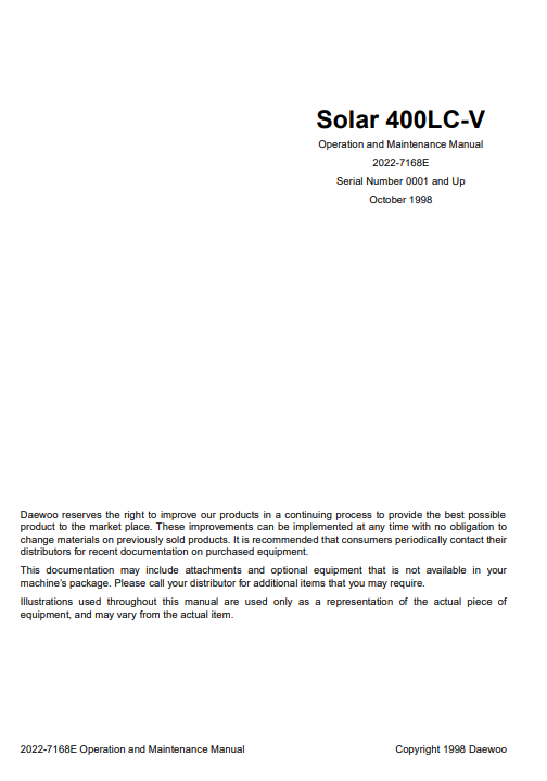 The Daewoo Solar 400LC-V Operation and Maintenance Manual is an essential resource for ensuring the optimal performance and longevity of your equipment. This comprehensive guide provides detailed instructions on operation, maintenance procedures, and troubleshooting tips, empowering users to maximize efficiency and minimize downtime. With clear diagrams and step-by-step guidance, this manual is designed to enhance your understanding and management of the Daewoo Solar 400LC-V, making it an indispensable tool for operators and technicians alike