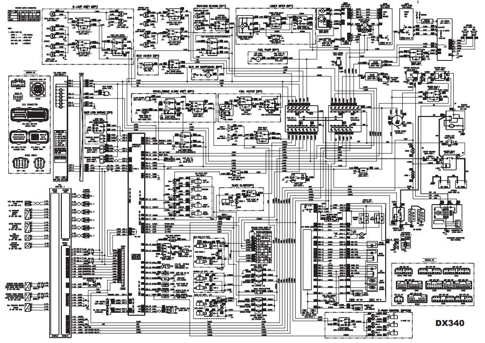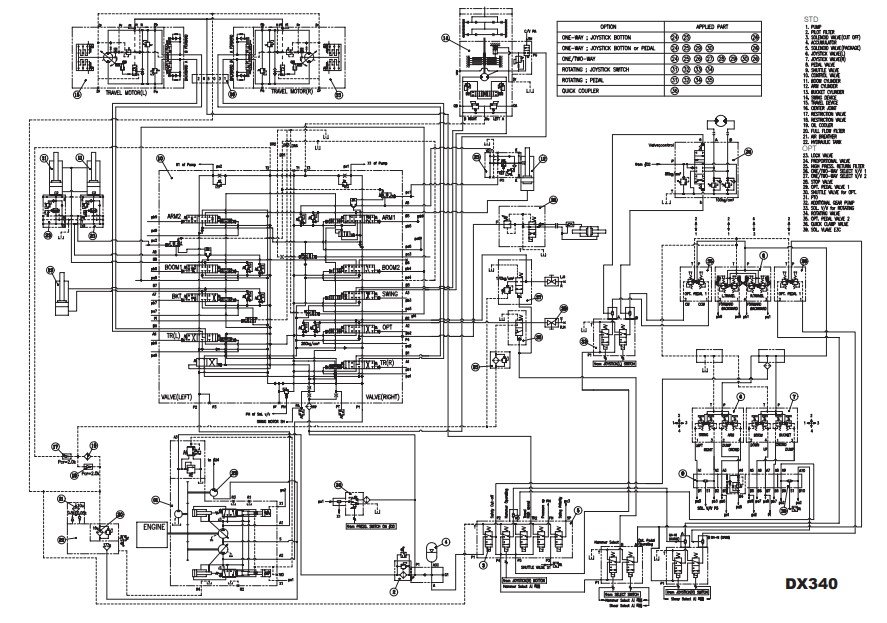 Diagrams illustrating the electrical and hydraulic systems of the Doosan DX340LC excavator for technical referenceDoosan DX340LC Electrical & Hydraulic Diagrams