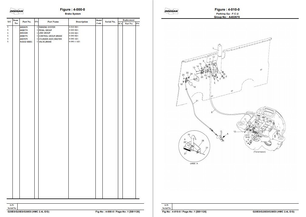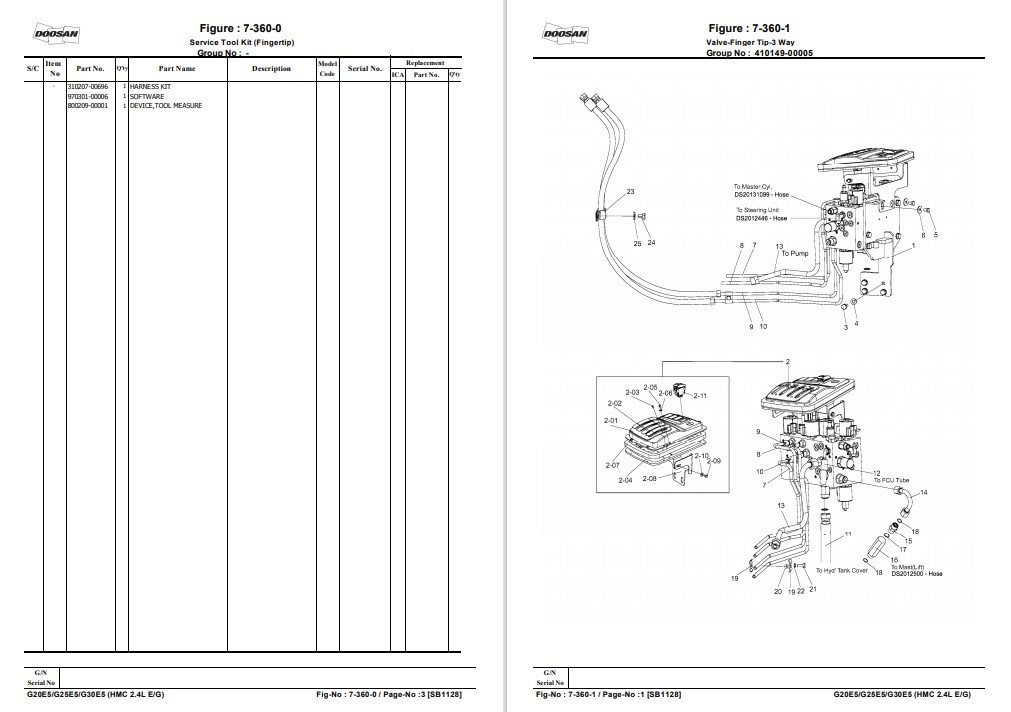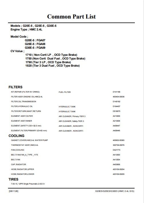 Doosan G20E-5, G25E-5, G30E-5 Fork Lift Parts Manual
