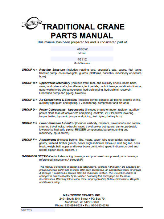 The Grove 4000W Crane Parts Manual is an essential resource for operators and technicians, providing comprehensive guidance on the maintenance and repair of your crane. This manual features detailed diagrams, part numbers, and specifications, ensuring you have the information needed to keep your equipment running smoothly and efficiently. With its user-friendly layout, you can quickly locate the necessary parts and instructions, minimizing downtime and enhancing productivity on the job site. Invest in this manual to ensure the longevity and reliability of your Grove 4000W Crane