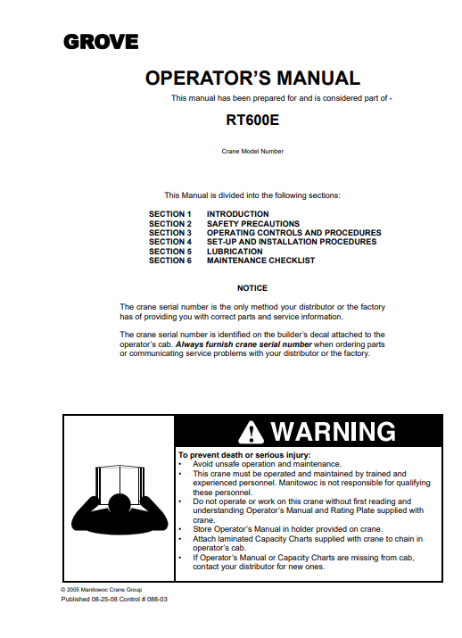 Grove RT600E Crane Operator's Manual cover featuring the crane and safety instructions for operatorsGrove RT600E Crane Operator’s Manual