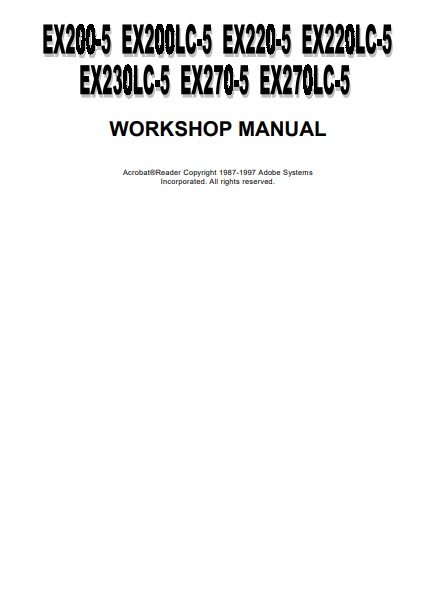 This official Hitachi Workshop Service Manual provides complete technical information and step-by-step service instructions for the Hitachi EX200-5, EX200LC-5, EX220-5, EX220LC-5, EX230LC-5, EX270-5, and EX270LC-5 Hydraulic Excavators.