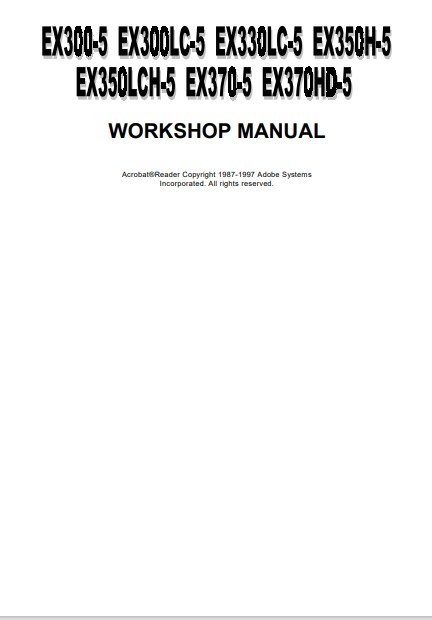 This official Hitachi Workshop Service Manual provides complete technical information, detailed servicing procedures, and troubleshooting guidance for the Hitachi EX300-5, EX300LC-5, EX330LC-5, EX330H-5, EX330LCH-5, EX370-5, and EX370HD-5 Hydraulic Excavators.