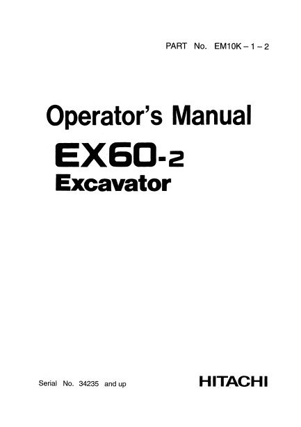 This official Operator’s Manual is specifically for the Hitachi EX60-2 Excavator, covering serial numbers 34235 and up. It’s the essential guide for safe operation, daily maintenance, and proper handling of your equipment—perfect for operators, owners, and job site supervisors.