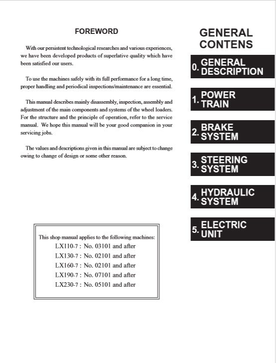 Enhance your maintenance capabilities with the Hitachi LX110-7, LX130-7, LX160-7, LX190-7, and LX230-7 Wheel Loader Workshop Manual. This comprehensive guide provides detailed instructions, diagrams, and troubleshooting tips specifically designed for these models, ensuring you can perform repairs and maintenance with confidence. With this manual, you’ll save time and money by tackling issues in-house, prolonging the life of your equipment and maximizing productivity on the job site. Invest in your operational efficiency today with this essential resource