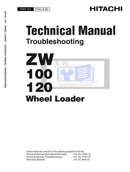 Technical troubleshooting manual for Hitachi ZW 100 Wheel Loader, showcasing the loader and essential repair informationHitachi ZW 100 Wheel Loader Technical Troubleshooting Manual