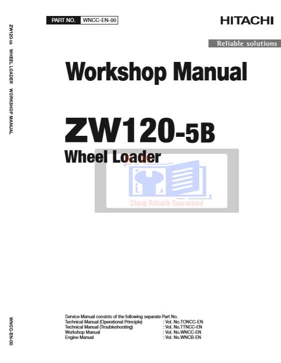 Hitachi ZW120-5B Wheel Loader workshop manual, displaying the loader and essential maintenance informationHitachi ZW120-5B Wheel Loader Workshop Manual