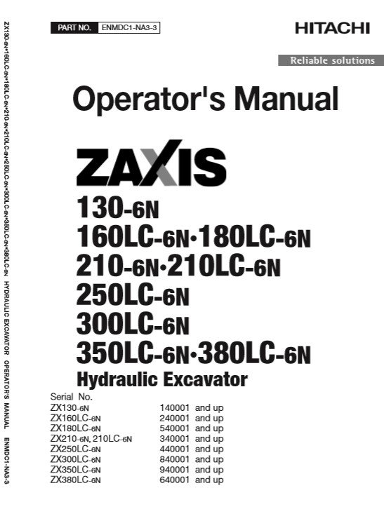 Stay safe, efficient, and productive with the official Operator’s Manual for Hitachi ZX130-6 through ZX380-6 excavators. This manual is your essential guide to operating, maintaining, and understanding your Hitachi Zaxis-6 series machine. Whether you’re a new operator or an experienced professional, this manual ensures you’re equipped with the correct procedures and safety information direct from the manufacturer.