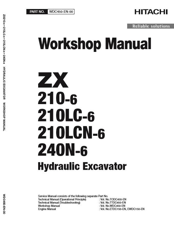 itachi ZX210-6 and ZX240N-6 Excavators Workshop Manual cover, featuring technical diagrams and specificationsHitachi ZX210-6 Series and ZX240N-6 Excavators Workshop Manual