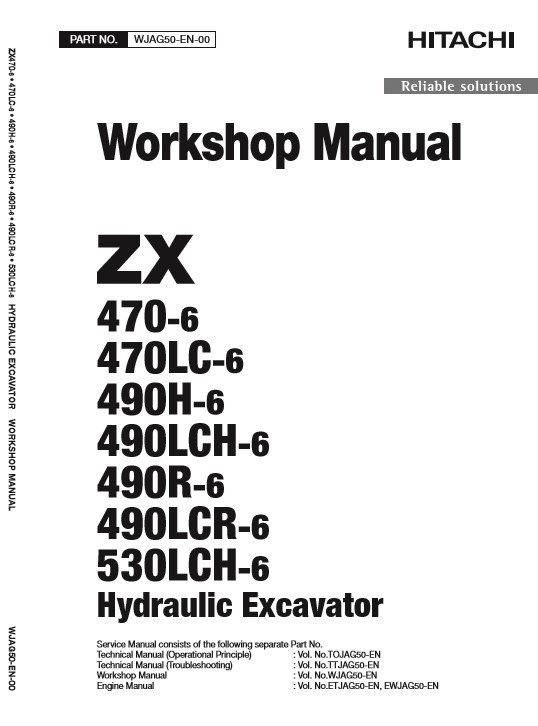 This manual package is the factory‑level service/manual documentation set for the Hitachi ZAXIS ZX470‑6, ZX490‑6 (including H/R/L variants), and ZX530‑6 (LCH variant) hydraulic excavators. It covers everything you need for maintenance, repair, troubleshooting, wiring and hydraulic diagrams, and general service operations