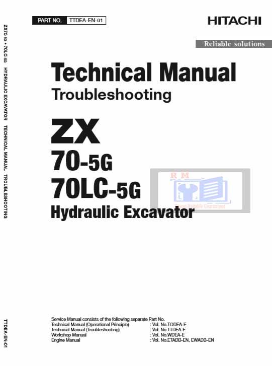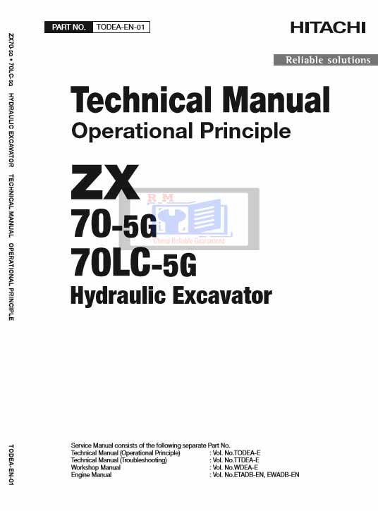Hitachi ZX70-5G and ZX70LC-5G excavator technical manuals, providing essential information for operation and maintenanceHitachi ZX70-5G, Hitachi ZX70LC-5G Excavator Technical Manuals