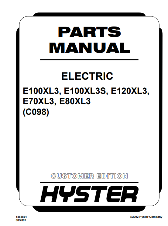 Hyster E100XL3, E100XL3S, E120XL3, E70XL3, E80XL3 (C098) Forklift Parts Manual