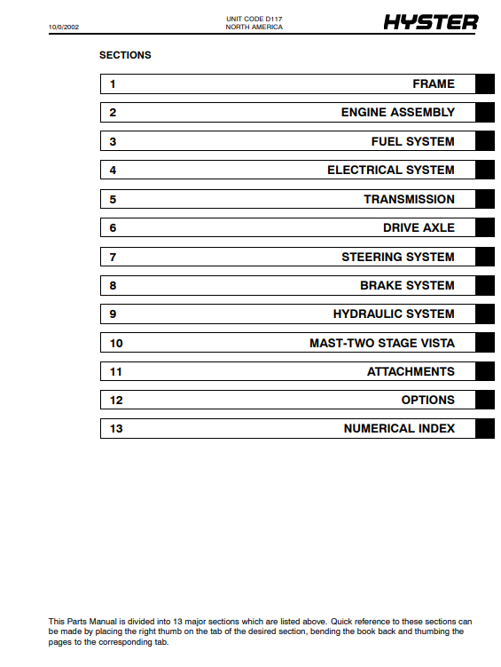 Enhance the performance and longevity of your Hyster forklifts with the comprehensive Parts Manual for models H1050EH, H800E, H880E, and H970E (D117). This essential guide provides detailed diagrams and specifications, ensuring you can easily identify and source the right parts for maintenance and repairs. With clear instructions and part numbers at your fingertips, you can minimize downtime and keep your equipment running smoothly, ultimately boosting productivity and efficiency in your operations. Invest in this Parts Manual today to ensure your Hyster forklifts remain in peak condition