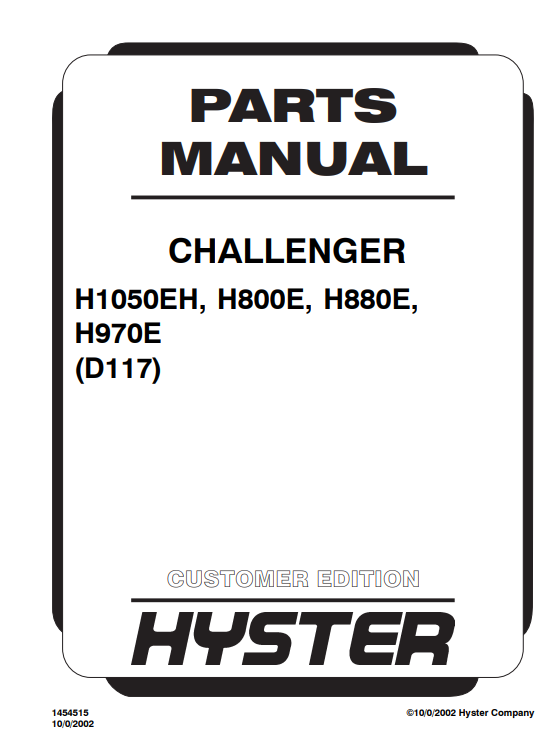 Hyster parts manual covering H1050EH, H800E, H880E, and H970E, providing essential information for maintenance and repairsHyster H1050EH, Hyster H800E, Hyster H880E, Hyster H970E (D117) Parts Manual