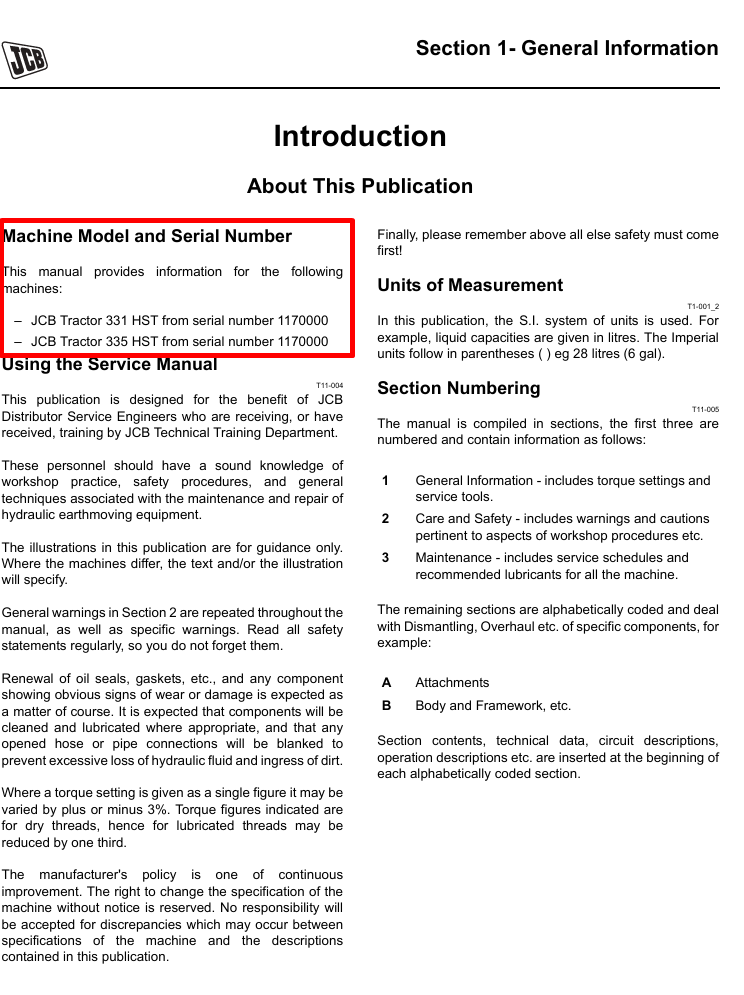 With this original factory Service manual, the technician can detect and solve any problems encountered when repairing your JCB 335 HST Tractor and This workshop repair manual for the JCB 335 HST Tractor provides detailed instructions and technical information for maintenance and repair tasks to keep your equipment in top condition.