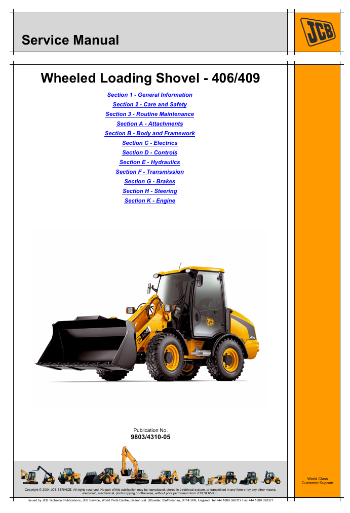 With this original factory Service manual, the technician can detect and solve any problems encountered when repairing your JCB 406 Wheel Loader and This workshop repair manual for the JCB 406 Wheel Loader provides detailed instructions and technical information for maintenance and repair tasks to keep your equipment in top condition.