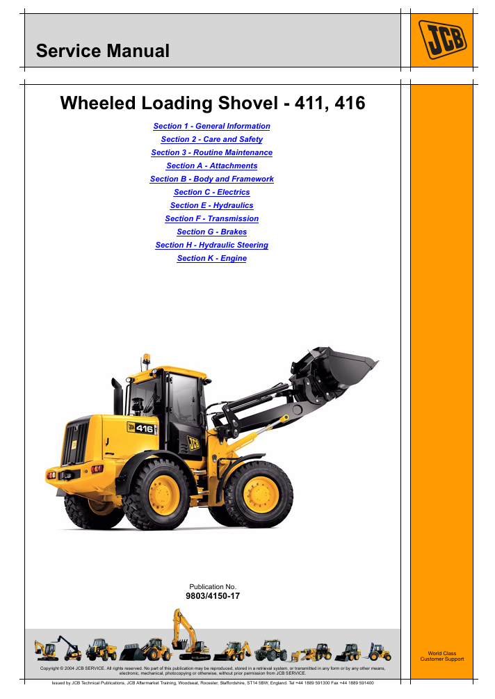 With this original factory Service manual, the technician can detect and solve any problems encountered when repairing your JCB Wheel Loader and This workshop repair manual for the JCB 416 Wheeled Loading Shovel provides detailed instructions and technical information for maintenance and repair tasks to keep your equipment in top condition.