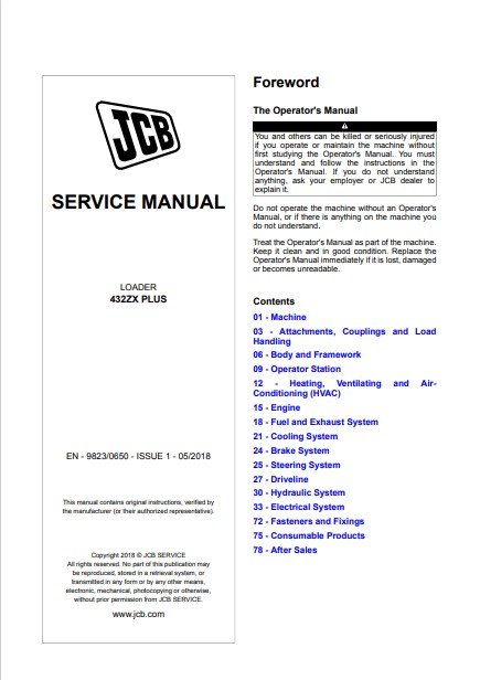 This comprehensive factory manual is the official OEM service guide used by authorized JCB dealers and certified technicians. It includes detailed step-by-step instructions, high-quality diagrams, and complete maintenance procedures to ensure reliable repair and upkeep of your JCB 432ZX PLUS Loader.