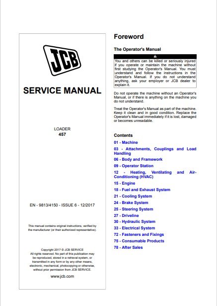 The JCB 457 Loader Service Repair Manual is an essential resource for maintaining and repairing your equipment efficiently. This comprehensive guide provides detailed instructions, diagrams, and troubleshooting tips, ensuring that you can perform repairs with confidence and precision. With this manual, you can extend the lifespan of your loader, minimize downtime, and enhance overall performance, making it a valuable investment for any operator or technician