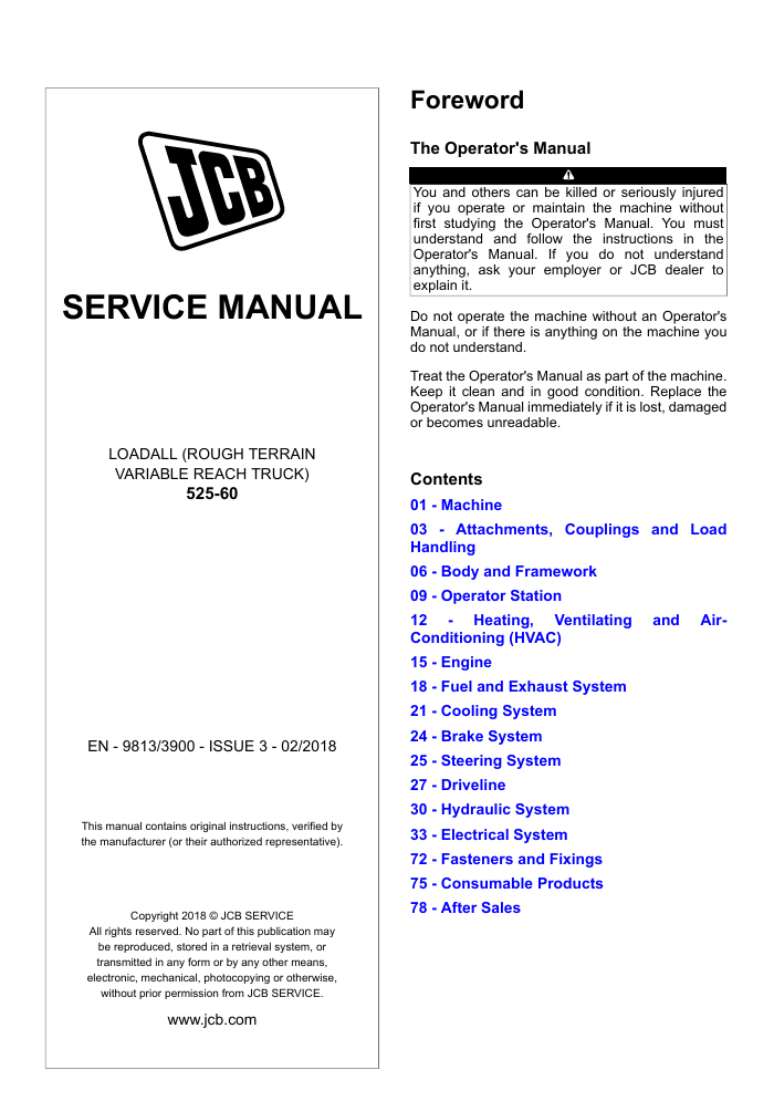 With this original factory Service manual, the technician can detect and solve any problems encountered when repairing your JCB 525-60 Loadall and This workshop repair manual for the JCB 525-60 Loadall provides detailed instructions and technical information for maintenance and repair tasks to keep your equipment in top condition.