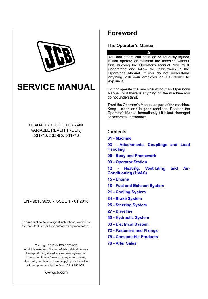 With this original factory Service manual, the technician can detect and solve any problems encountered when repairing your JCB 531-70 Loadall and This workshop repair manual for the JCB 531-70 Loadall provides detailed instructions and technical information for maintenance and repair tasks to keep your equipment in top condition.
