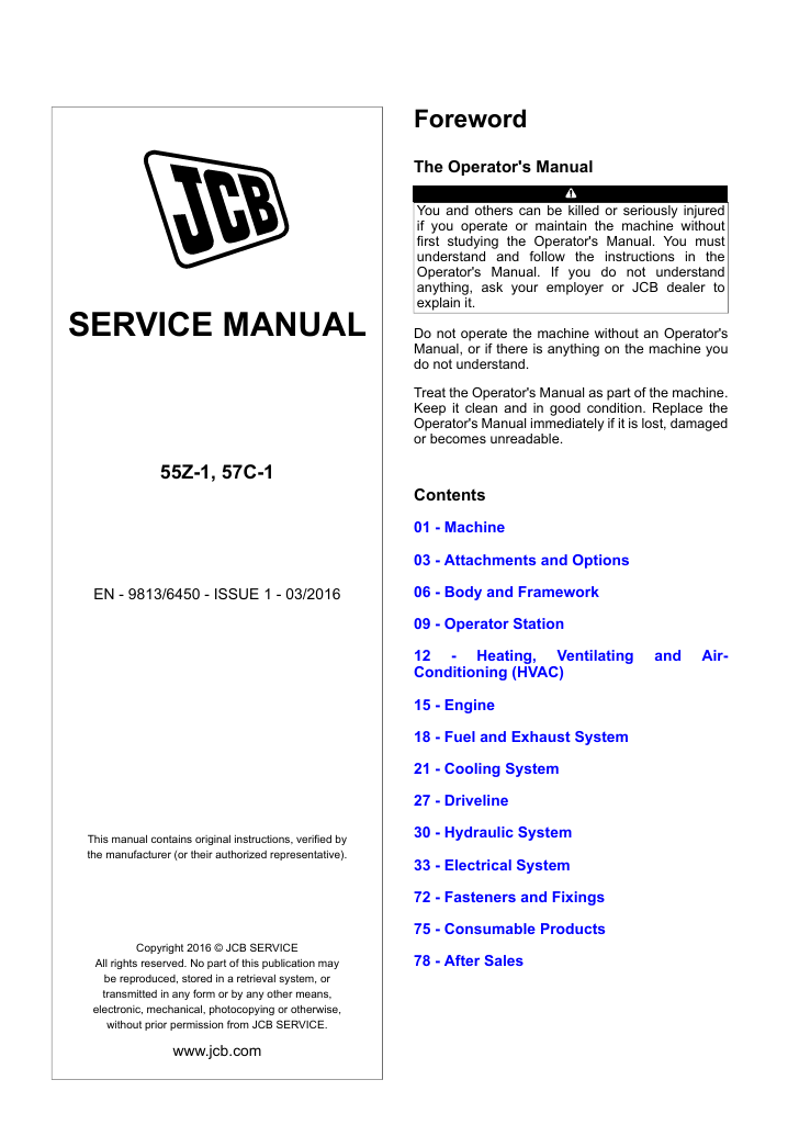 With this original factory Service manual, the technician can detect and solve any problems encountered when repairing your JCB 55Z-1 Mini Excavator and This workshop repair manual for the JCB 55Z-1 Mini Excavator provides detailed instructions and technical information for maintenance and repair tasks to keep your equipment in top condition.