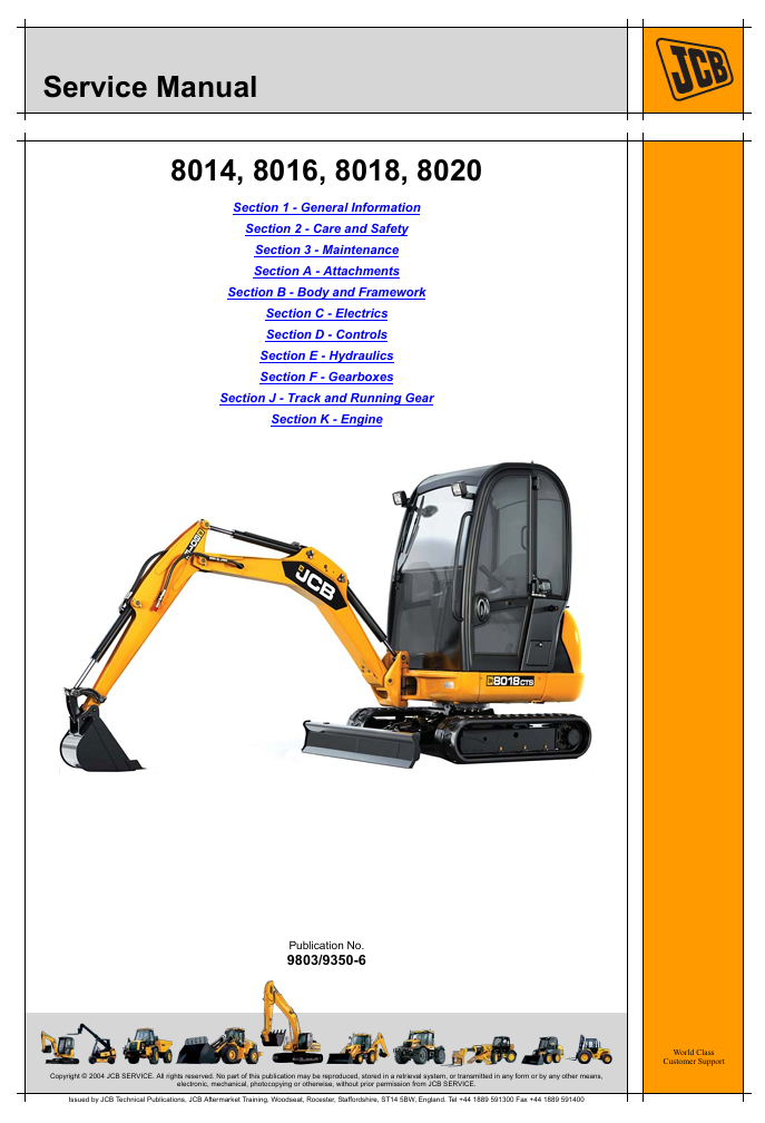 With this original factory Service manual, the technician can detect and solve any problems encountered when repairing your JCB 8020 Mini Excavator and This workshop repair manual for the JCB 8020 Mini Excavator provides detailed instructions and technical information for maintenance and repair tasks to keep your equipment in top condition.
