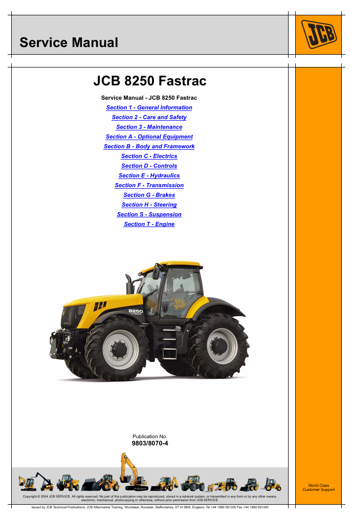 With this original factory Service manual, the technician can detect and solve any problems encountered when repairing your JCB Fastrac 8250 and This workshop repair manual for the JCB Fastrac 8250 provides detailed instructions and technical information for maintenance and repair tasks to keep your equipment in top condition.