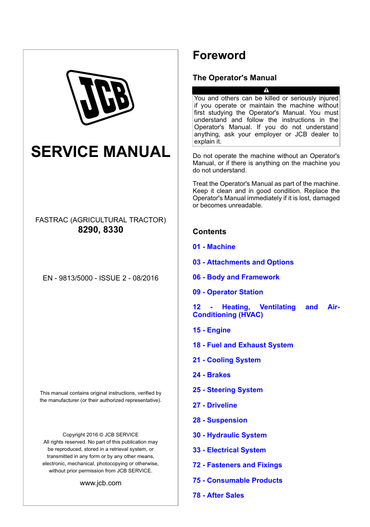 Original Factory Service Repair Manual for the JCB Fastrac 8330. This manual is very detailed and contains all the official JCB manufacturer specifications, troubleshooting, repair instructions step by step with illustrations and wiring diagrams. Simple to complicated repairs can be completed effortlessly with the information provided. It is 100 percent complete and intact. The manual is specifically written for the DIY as well as the experienced mechanic