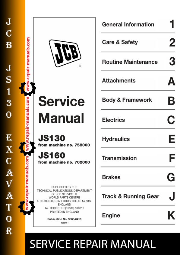 With this original factory workshop manual, the technician can detect and solve any problems encountered when repairing your jcb Excavator and This workshop repair manual for the JCB JS130 Excavator provides detailed instructions and technical information for maintenance and repair tasks to keep your equipment in top condition.