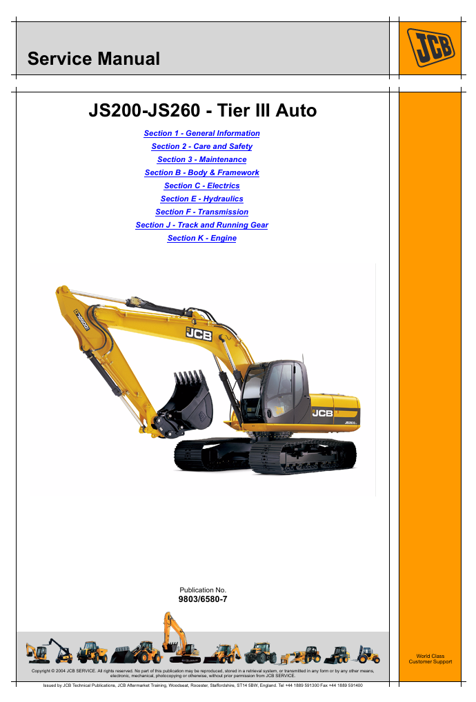 With this original factory Service manual, the technician can detect and solve any problems encountered when repairing your JCB JS235 Excavator and This workshop repair manual for the JCB JS235 Excavator provides detailed instructions and technical information for maintenance and repair tasks to keep your equipment in top condition.
