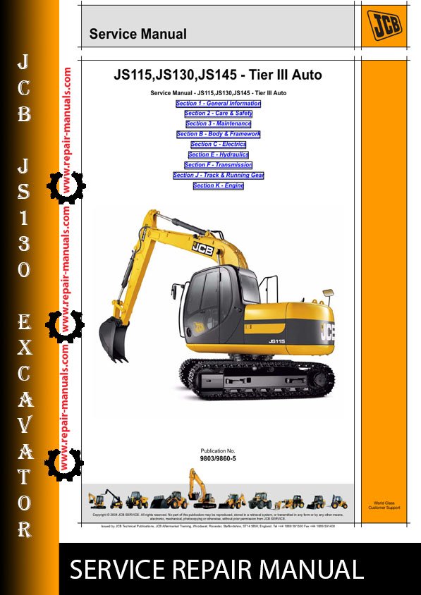 With this original factory workshop manual, the technician can detect and solve any problems encountered when repairing your jcb Excavator and This workshop repair manual for the JCB JS130 Excavator provides detailed instructions and technical information for maintenance and repair tasks to keep your equipment in top condition.